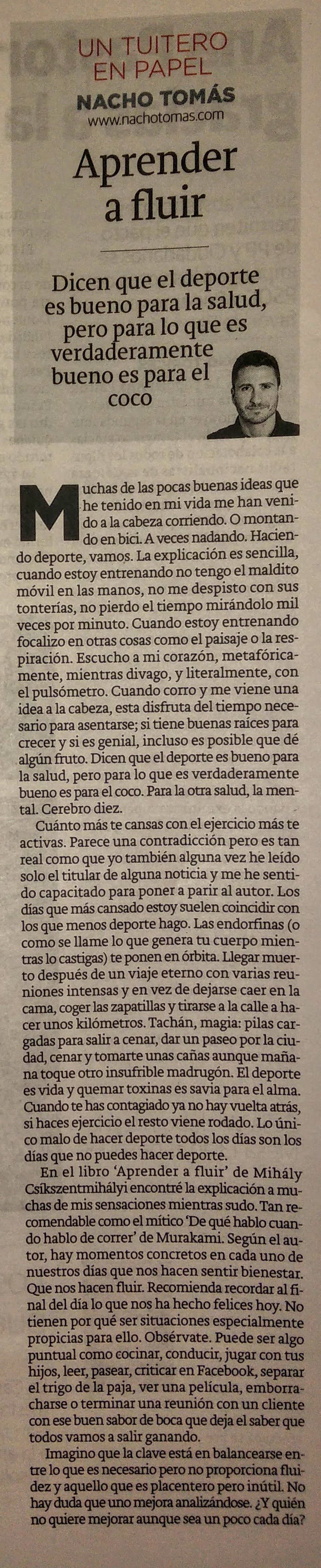 En el libro «Aprender a fluir» de Mihály Csíkszentmihályi encontré la explicación a muchas de mis sensaciones mientras sudo. Tan recomendable como el mítico “De qué hablo cuando hablo de correr” de Murakami. Según el autor hay momentos concretos en cada uno de nuestros días que nos hacen sentir bienestar. Que nos hacen fluir. Recomienda recordar al final del día lo que nos ha hecho felices hoy. No tienen por qué ser situaciones especialmente propicias para ello. Obsérvate. Puede ser algo puntual como cocinar, conducir, jugar con tus hijos, leer, pasear, criticar en Facebook, separar el trigo de la paja, ver una película, emborracharse o terminar una reunión con un cliente con ese buen sabor de boca que deja el saber que todos vamos a salir ganando.
