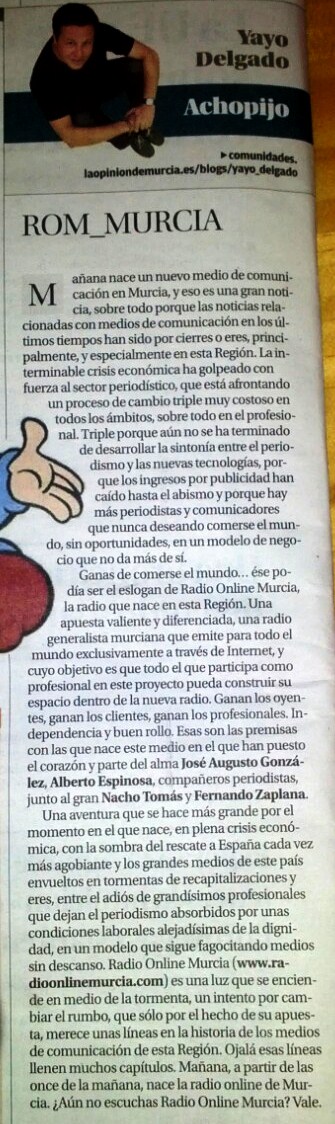 Ha llegado el día. Radio Online Murcia (ROM) comienza a emitir hoy, viernes 14 de Septiembre, con la presentación de la programación y nuestros colaboradores en directo. El próximo lunes, 17 de Septiembre, comenzamos con nuestras 1o horas diarias.